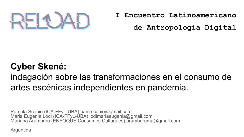 Presenté la ponencia «Cyber Skené: indagación sobre las transformaciones en el consumo de artes escénicas independientes en pandemia». En esta exposición, exploré cómo la digitalización impactó en los modos de consumo de las artes escénicas independientes durante la pandemia, proponiendo un análisis sobre las transformaciones culturales y económicas en este contexto.
