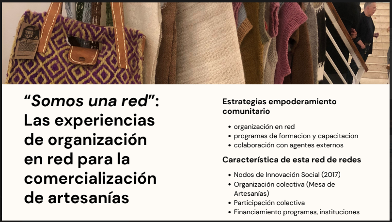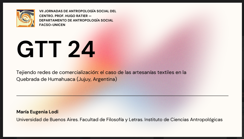 Presenté la ponencia “Tejiendo redes de comercialización: el caso de las artesanías textiles en la Quebrada de Humahuaca (Jujuy, Argentina)”, donde analicé las redes de colaboración y comercialización entre productores textiles.